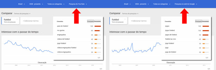 Por último, quando olhamos as buscas feitas no YouTube, temos como resultado vídeos de futebol e a música do Mc Guime, País do Futebol. Conhecer essa diferenciação, pode ser muito útil na hora de otimizar suas buscas por imagens ou vídeos;