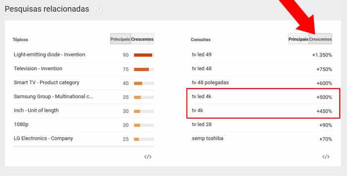 Assuntos e Pesquisas Relacionadas no Google Trends