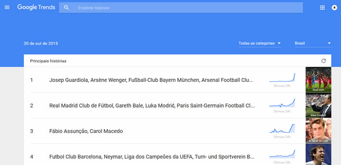 No Trends, é possível visualizar as principais e as crescentes consultas sobre qualquer assunto. Além disso, você consegue filtrar os resultados por: