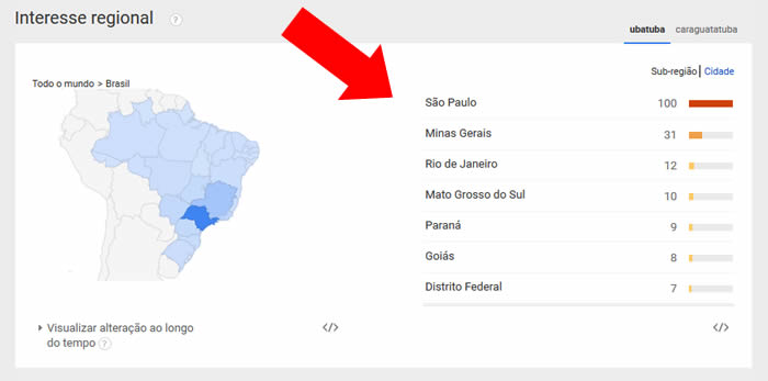 No bloco “Detalhamento comparado por sub-região”, é possível ver quais regiões do Brasil fazem mais buscas sobre o tema que você deseja promover. Veja como é simples analisar os dados: