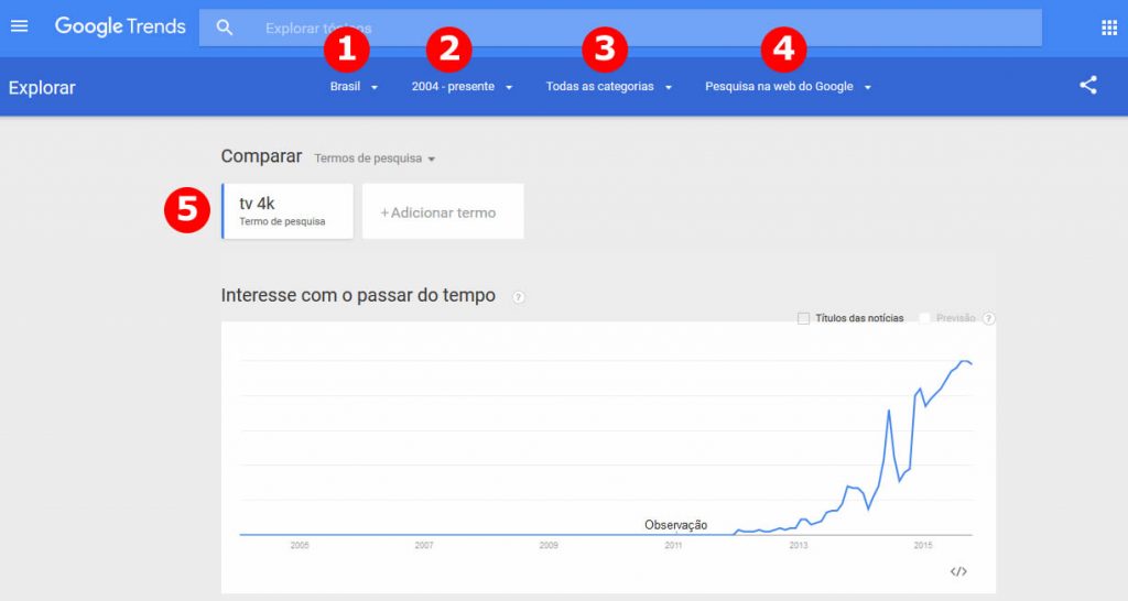 Assim que escolher o termo de pesquisa, você confere um gráfico que mostra a evolução das pesquisas para o termo escolhido ao longo do tempo. Nela você poderá alterar o país, o intervalo de tempo, a categoria e a fonte da busca.