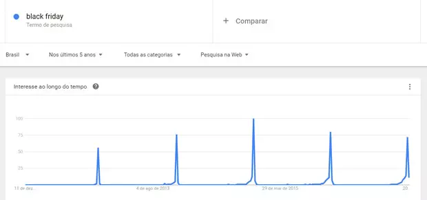 Por exemplo, se procurarmos pela palavra-chave “black friday”, fica evidente no gráfico, um pico de buscas que se inicia no mês de outubro e tem seu ponto alto em novembro, que é o mês em que ocorre o evento.