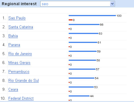 No bloco “Detalhamento comparado por sub-região”, é possível ver quais regiões do Brasil fazem mais buscas sobre o tema que você deseja promover. Veja como é simples analisar os dados: