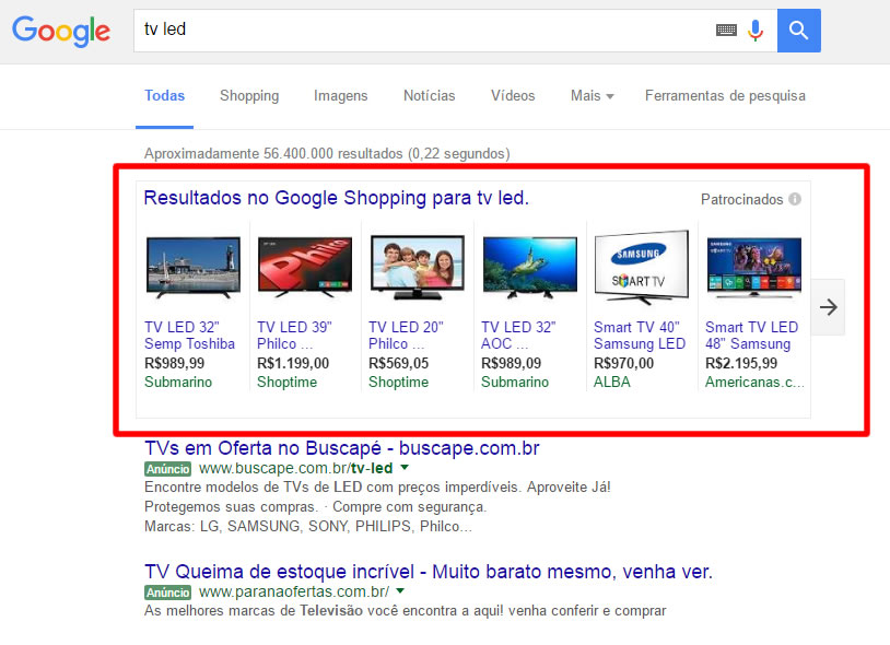 Para acessar ou “ativar” o Google Shopping basta digitar algum produto na barra de busca, por exemplo, o termo “tv led”: