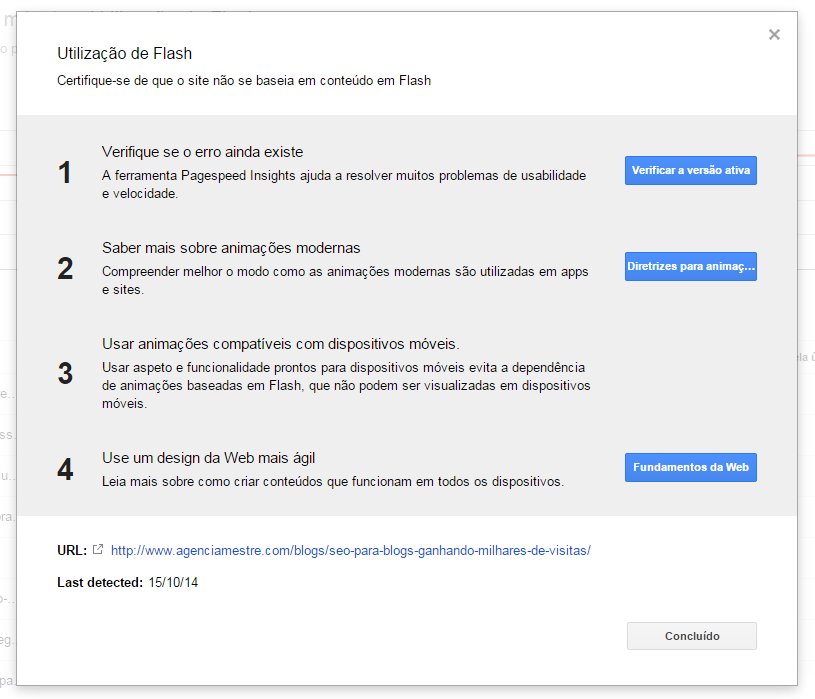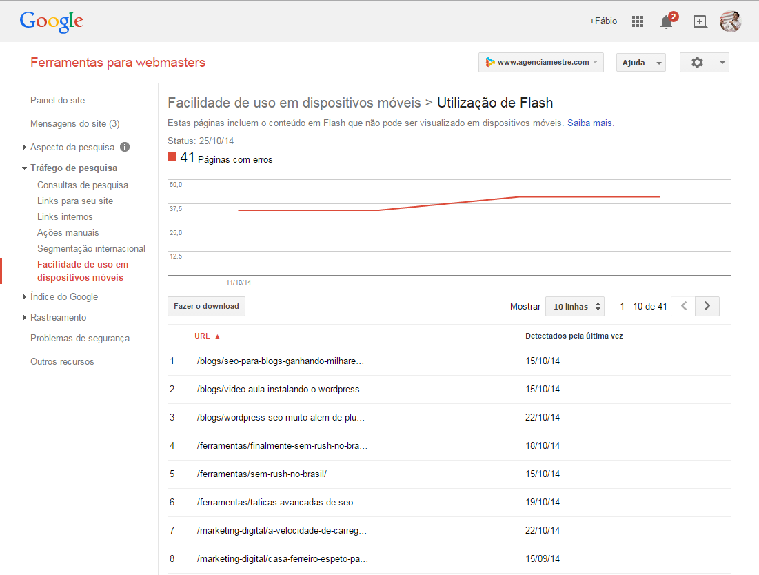 Este relatório lista algumas das informações do Search Console, em especial, você obtém a lista de mensagens não lidas e gráficos sobre erros de rastreamento, Search Analytics e Sitemaps, uma forma rápida de verificar a “saúde” do seu site. Se qualquer destes itens apontar problemas, você realmente precisa tomar uma ação apropriada, conforme o caso.