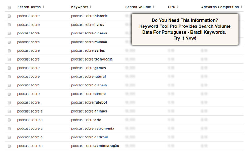 Mesmo não sendo um termo conhecido pela grande massa, as pessoas têm buscado cada vez mais descobrir novos podcasts para ouvir. O interessante é que essas buscas são realizadas em diversos nichos de mercado. Utilizando a ferramenta Keyword Tool, percebemos a variedade: