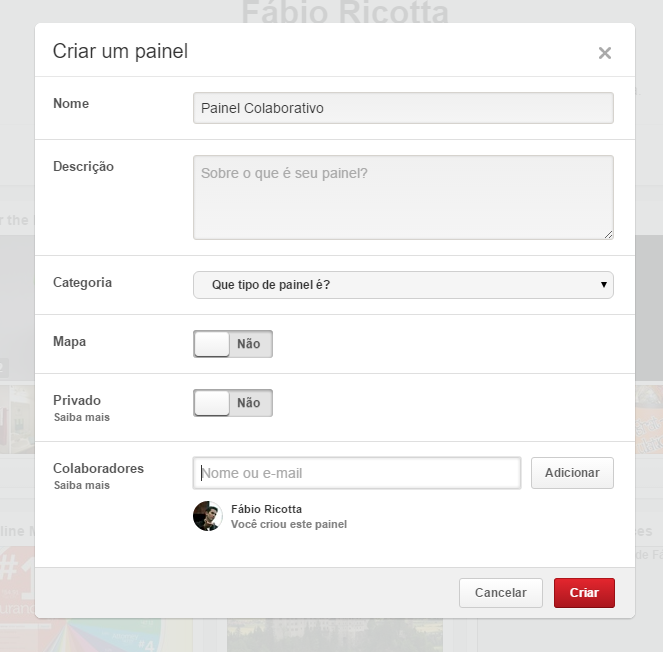Indo ao seu perfil (através da sua foto), é possível organizar seus Boards, ou quadros. Trata-se de uma simples categorização dos seus posts – assim fica mais simples organizar os “assuntos” das suas imagens.