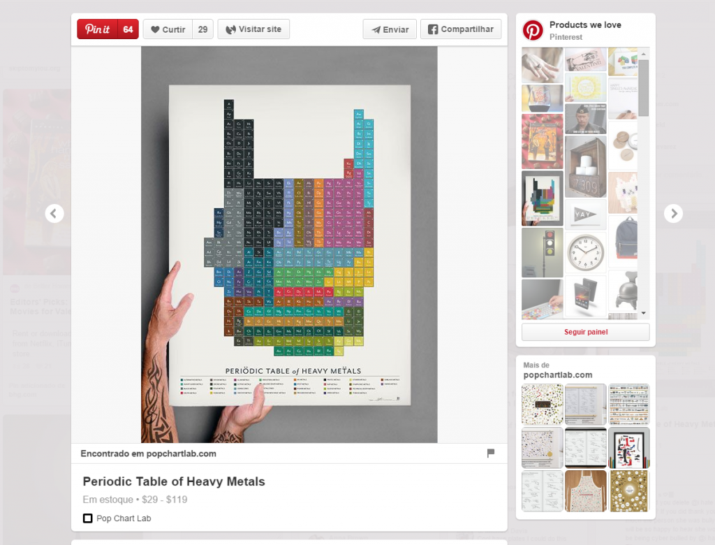 E é nesse espírito que entra a veia comercial. Algumas pessoas publicam itens em seus Pinterests diretamente de uma página de produto. Intencionalmente, ou não, o pin nos dá a chance de olhar um produto e, na hora, clicar no link para ir direto ao site da loja.
