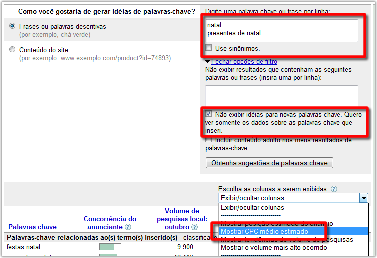 Para usar o Keyword External Tool para ver os dados de CPC da sua lista de palavras, cole as palavras na ferramenta, marque a opção “Não exibir idéias para novas palavras-chave. Quero ver somente os dados sobre as palavras-chave que inseri” e selecione “Mostrar CPC Médio Estimado”: