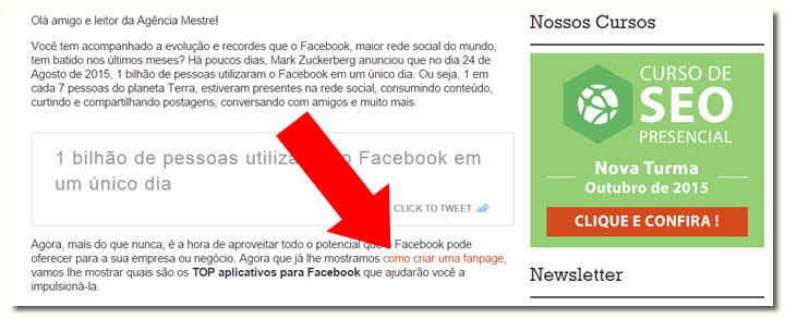 Por exemplo, quando eu reescrevi um dos artigos do blog da Agência Mestre, o qual falava sobre os top aplicativos de Facebook para sua fan page, eu mencionei um assunto que já tinhamos abordado anteriormente, a criação de uma fanpage. Por isso, aproveitei o texto âncora “como criar uma fanpage” para referenciar tal artigo através de um link direto para ele.