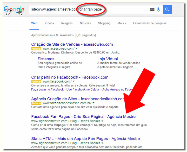 No exemplo que estou utilizando neste artigo, o procedimento que eu fiz para descobrir a melhor página do meu site que falava sobre criação de fan page, foi utilizar o comando: site:www.agenciamestre.com criar fan page