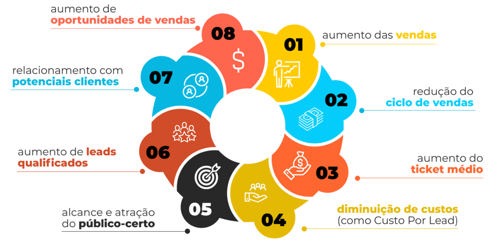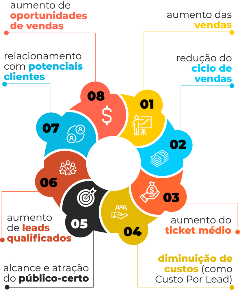 Nosso trabalho não se restringe à captação de leads. Fazemos a conversão de contatos em clientes. Criamos oportunidades para aumentar as vendas da sua empresa por meio de: