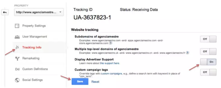 Primeiro, acesse o Admin do Google Analytics. Em seguida, escolha a conta e o site (propriedade) e abra as opções do Tracking Code, conforme indicado na imagem acima. Na próxima tela, da imagem abaixo, O que você precisa fazer é habilitar a terceira opção, conforme indicado: