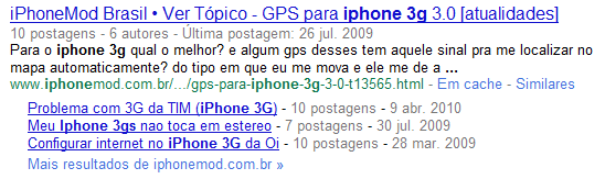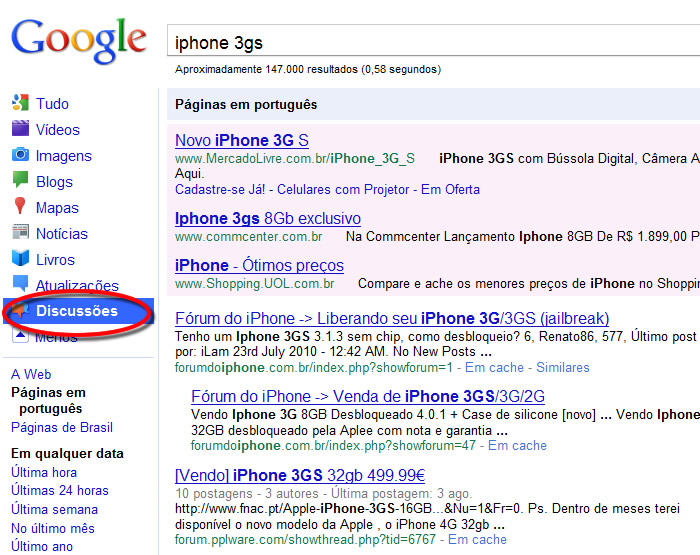 Digamos que eu sou um proprietário de e-Commerce de celulares, onde quero dar mais relevância para a página onde vendo o iPhone 3Gs. O primeiro passo para melhorar este conteúdo é identificar o que se discute em fóruns da área de celular. Para isto, a melhor ferramenta é o Google, onde você pode selecionar o vertical de “Discussões” que fica na coluna da esquerda: