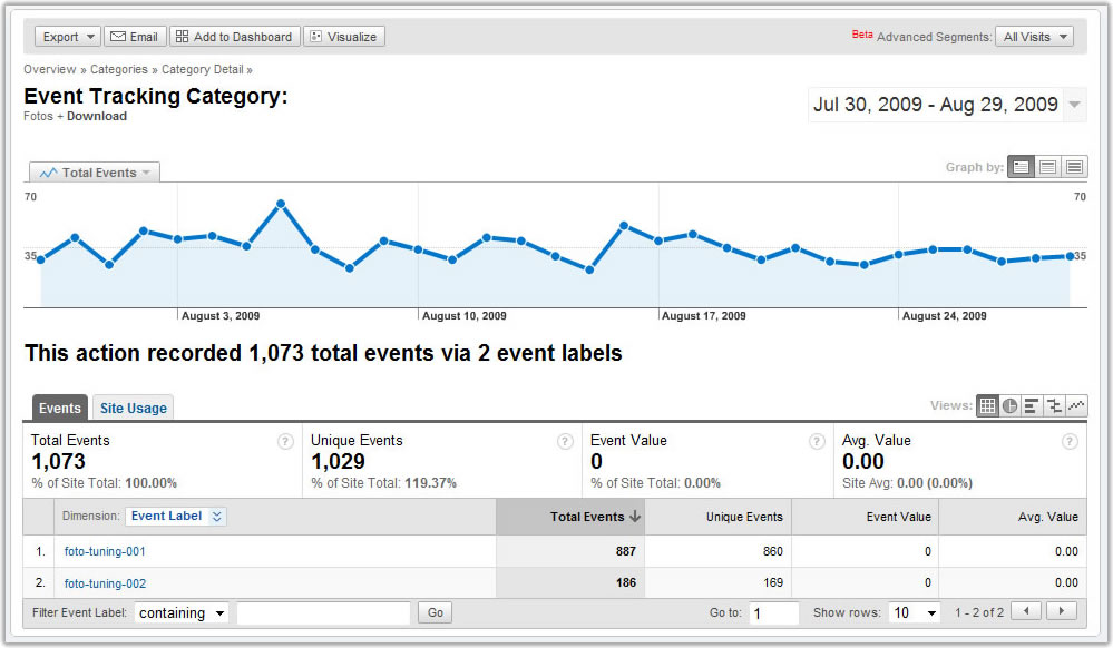 Os dados podem ser separados por categories, actions, labels, e são exibidos através de gráfico, do mesmo jeito que são exibidas suas visitas: