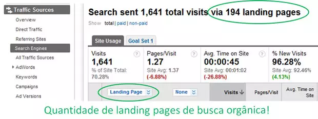 Para encontrar esta informação no Google Analytics, acesse a seção de Traffic Sources, escolha o tráfego por Search Engines e escolha “Google”. Na sequência, troque a exibição de Keyword para Landing Page e você poderá ver a quantidade de diferentes páginas que, de fato, recebem visitas oriundas no Google (lembre-se de filtrar por tráfego não pago, se for o caso):