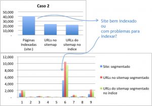 Ao passo que a busca site: em comparação com as URLs no Sitemap.XML apresentavam até um quadro comum e, apesar de o valor das URLs do Sitemap.XML no índice de resultados serem bem próximas do total de URLs do sitemap, quando executada a segmentação, um quadro de alerta se destacou: na verdade, por quase todo segmento do site, havia o dobro de URLs no Sitemap.XML do que era apresentado na busca segmentada com o comando site:, enquanto a quantidade de URLs no índice mantinha-se próximo do total de cada sitemap.