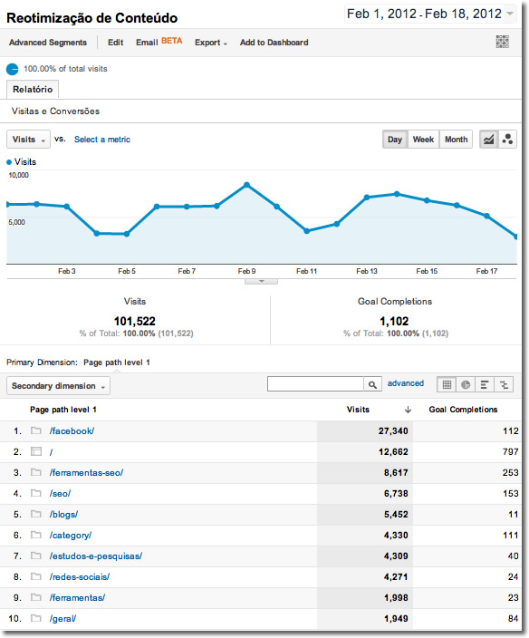Assim todos poderão identificar formas de otimizar o trabalho que desenvolvem a favor das conversões no site. Claro que as keywords somente serão úteis para SEO e links patrocinados, mas as outras fontes de tráfego poderão fazer a análise sobre o conteúdo e conversões da mesma maneira, acessando e navegando no sua respectiva fonte de tráfego de interesse.