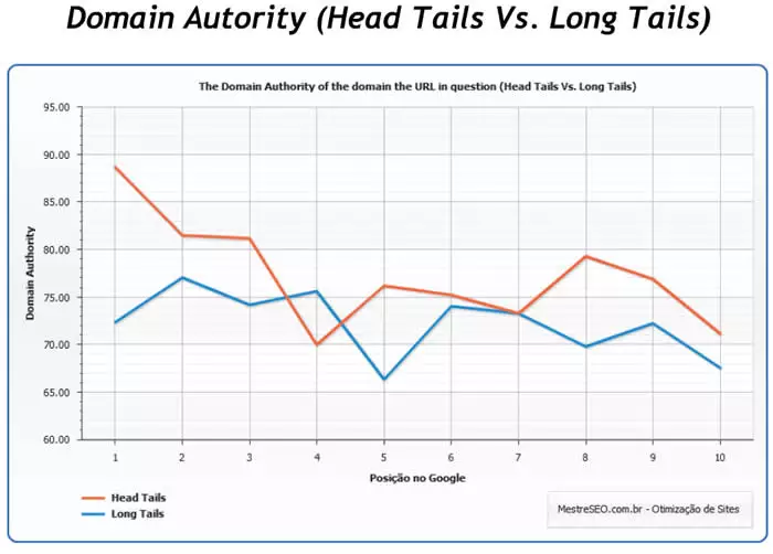 Embora menos importante nos termos mais genéricos, nos termos mais específicos de uma long tail, o Domain Authority tem uma correlação maior com bons rankings.