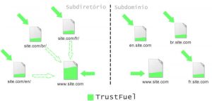 Quando se deseja oferecer conteúdo em múltiplas línguas, normalmente 2 a 5 caracteres novos são adicionados à url (en, pt-br, fr, en-us, etc). Nesses casos, cada nova seção criada para uma determinada língua (ou, às vezes, localização geográfica), é uma tradução do conteúdo original, e cada uma delas vai competir em um “Google diferente” (.com, .com.br, .com.fr, .co.uk, etc.) que é onde entra a importância de se decidir entre o uso de subdomínio ou subdiretório.