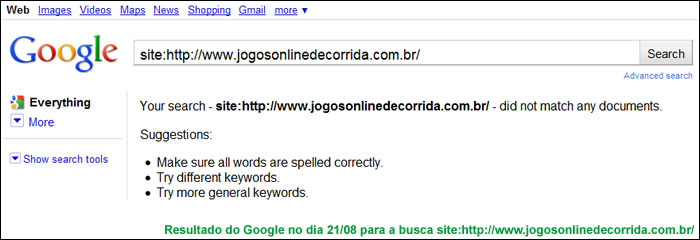 Segue abaixo o print do Google no mesmo dia (21/08), com a busca por “site:jogosonlinedecorrida.com.br”