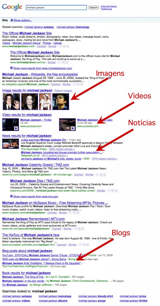Para entender como tirar proveito da técnica de SERP Domination, temos que analisar bem uma página de resultados dos mecanismos de busca. Quando em sua máxima riqueza, ela pode exibir os seguintes itens: