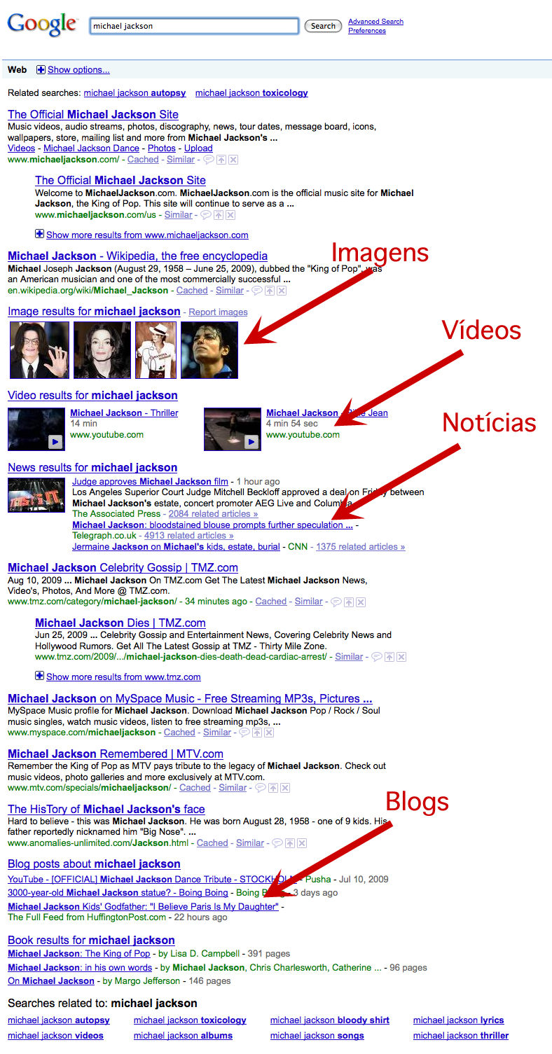 Uma das formas mais fáceis de se aparecer nos resultados universais é através de blogs. Apesar de serem a menor credibilidade do universal search, eles são uma forma rápida de mostrar uma informação.