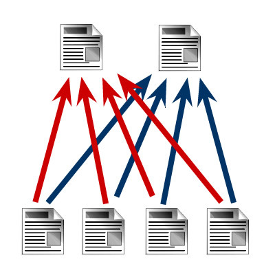 Uma dica interessante para conseguir os resultados identados é a seguinte: utilize o comando site:meusite.com palavra-chave no Google. Isto lhe dará as 10 páginas mais importantes do seu website para a palavra-chave que você deseja otimizar. De posse desta página, crie em cada uma, um link para cada uma das suas duas páginas alvo, ou seja, aquelas que deseja focar no SERP Domination. Isto irá fortalecê-las internamente. Aproveite também e crie um link entre as páginas alvo, utilizando da âncora que você deseja otimizar. Veja o esquema em forma de desenho: