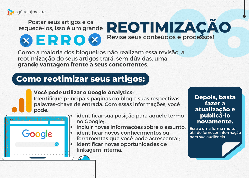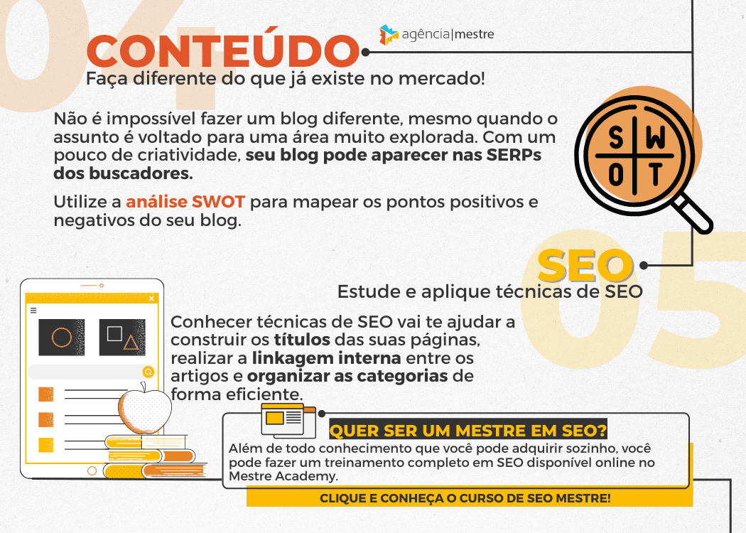 Existem vários materiais ricos, como artigos e e-books no blog da Agência Mestre que podem contribuir de várias formas com o sucesso do seu blog. Confira mais algumas dicas: