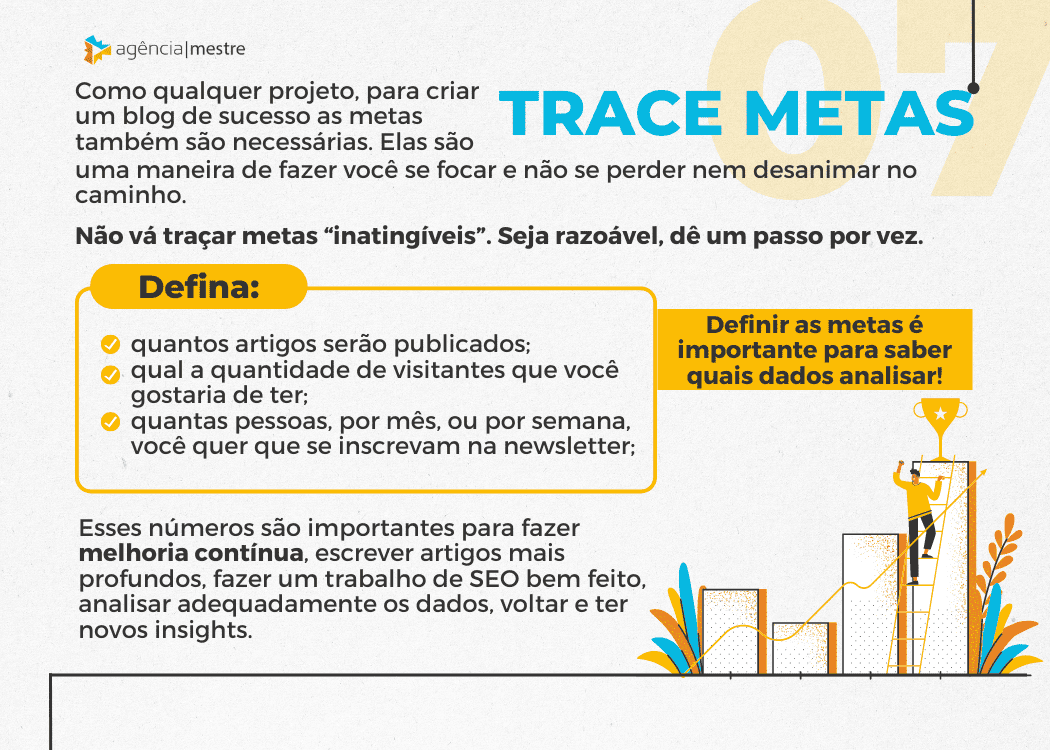 - estabelecimento de objetivos: definir o que você quer alcançar com seu blog torna mais fácil medir o sucesso da estratégia futuramente.
