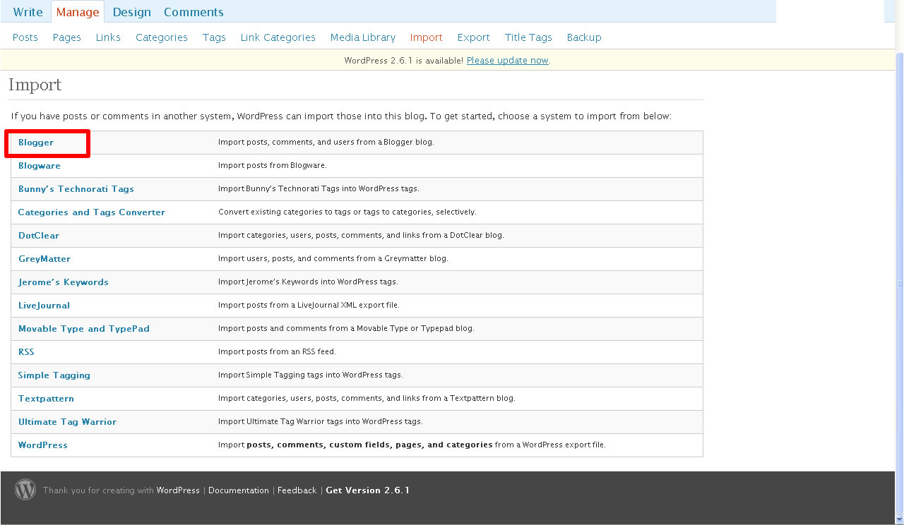 Note que quando o WP importa o seu blog algumas das palavras sem função semantica como preposições são retiradas das URL’s, que podem criar algums erros 404 até que você arrume as novas URL’s (irei falar sobre isso no 7º passo). E se você usava Blogger tag pages, então você terá que fazer o seu .htaccess um pouco mais complexo adicionando entradas para o redirecionamento das tag pages.