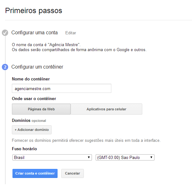 No passo seguinte você deve dar um nome ao container. No caso, coloque o nome do seu site. Este container irá guardar todas as tags/scripts do seu site.
