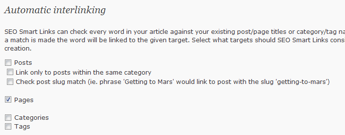 Como já citado anteriormente o plugin te dá a opção de escolher quais tipos de páginas linkar, e entre estes tipos estão: posts e páginas. Essa definição está bem clara na página de configurações do plugin.
