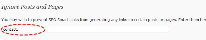 Nesse campo poderão ser inseridas as páginas e posts que não deverão ser linkadas no site. Assim como no exemplo acima onde o usuário exclui a página de contato de ser linkada.