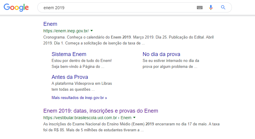 Em 2019, retomamos a mesma estratégia, mas atualizada e direcionada ao “ENEM 2019”. Atualmente, somos o segundo resultado na busca orgânica, atrás apenas do site oficial do ENEM: