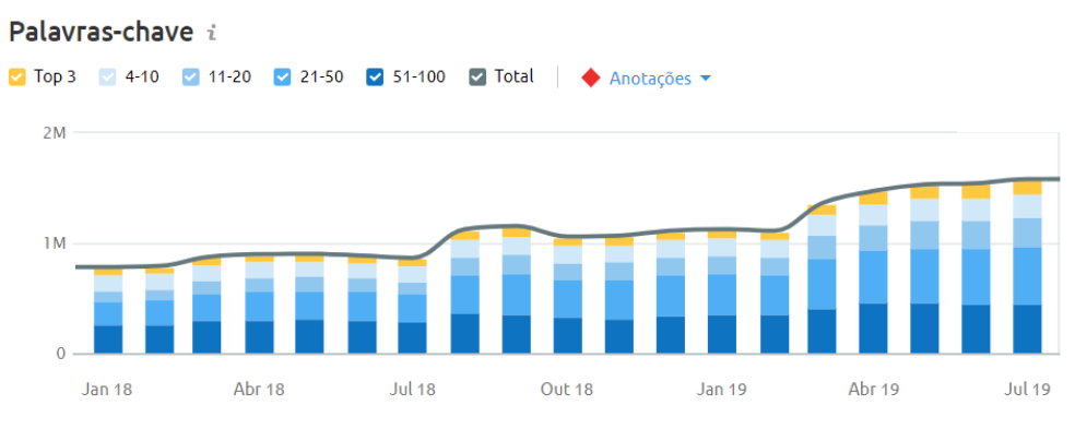 No início do projeto, em janeiro de 2018, contávamos com o total de 782.651 palavras-chave posicionadas. Hoje, no início do segundo semestre de 2019 — já depois de uma renovação para mais um ano de projeto — temos o total de 1.581.464 palavras-chave posicionadas, o que significa um aumento de 102%!