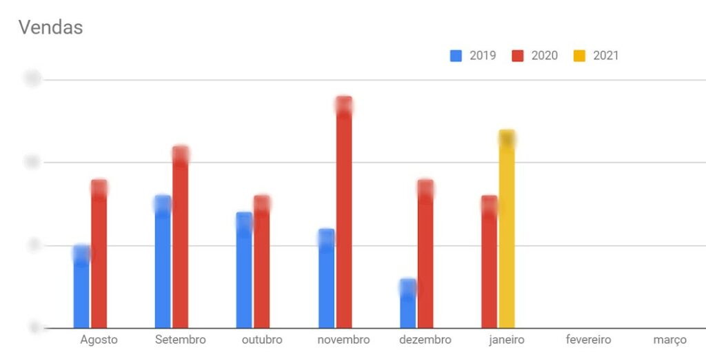 Gráfico de histórico de vendas dos últimos meses, comparando com o mesmo período do ano anterior.