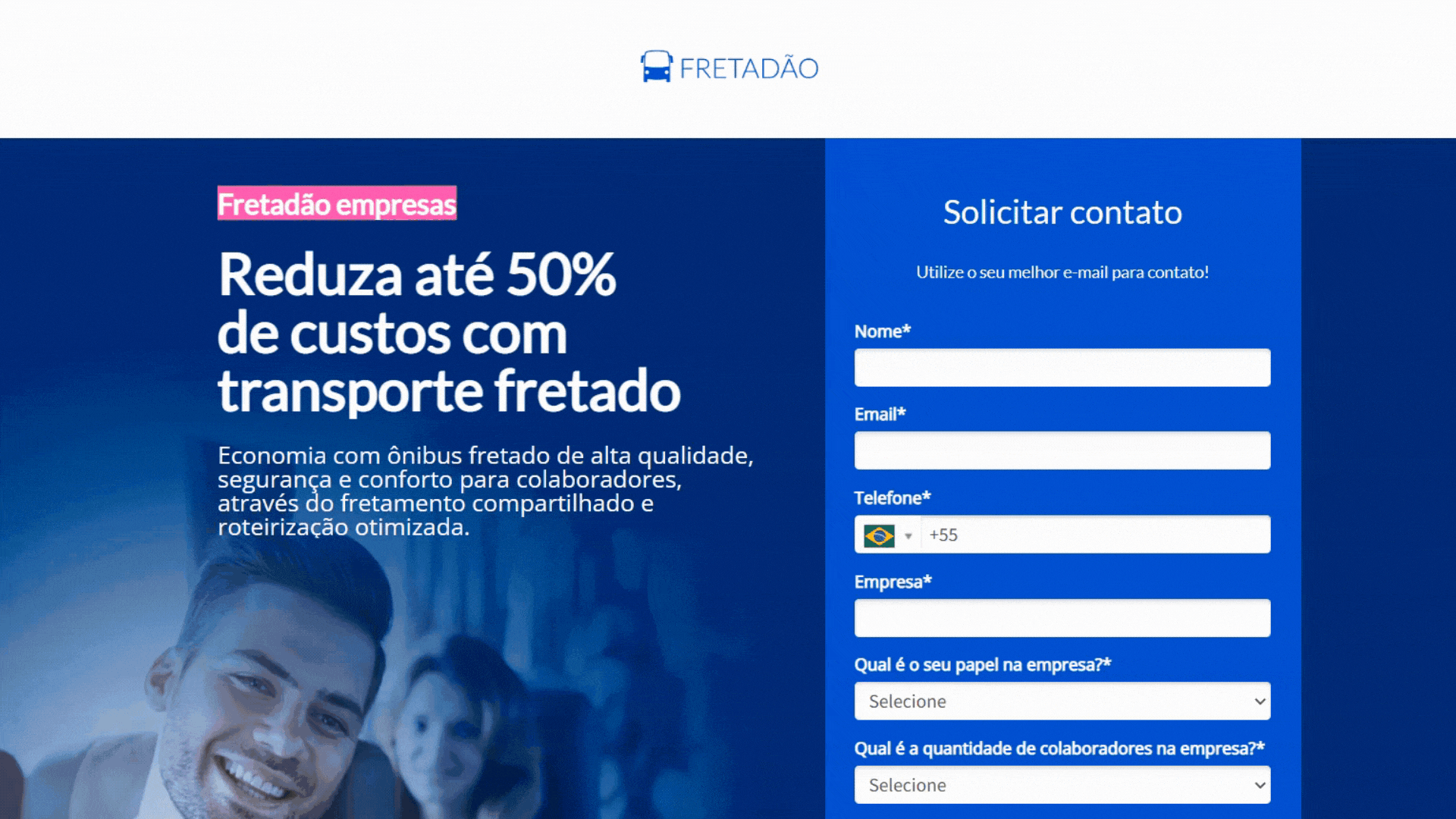 A empresa oferece soluções de mobilidade para colaboradores de grandes empresas, incluindo transporte seguro e confortável, dados em tempo real para o RH e redução de custos de até 50% nas despesas com transporte. Hoje, o Fretadão já transporta mais de 20 mil passageiros diariamente em 13 estados brasileiros!