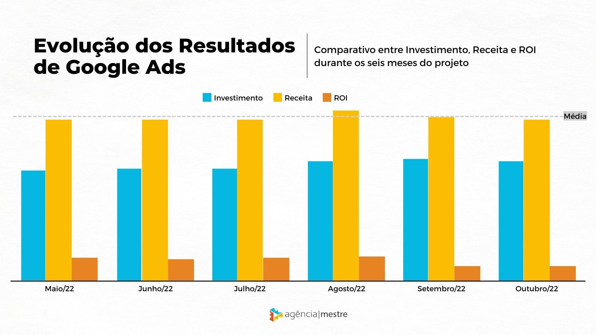 Tivemos nosso melhor resultado de Google Ads em agosto, chegando a um ROI de 16,8. No mês seguinte, atingimos o segundo melhor resultado, mesmo em um período em que o projeto costuma sofrer variação negativa devido a sazonalidade.