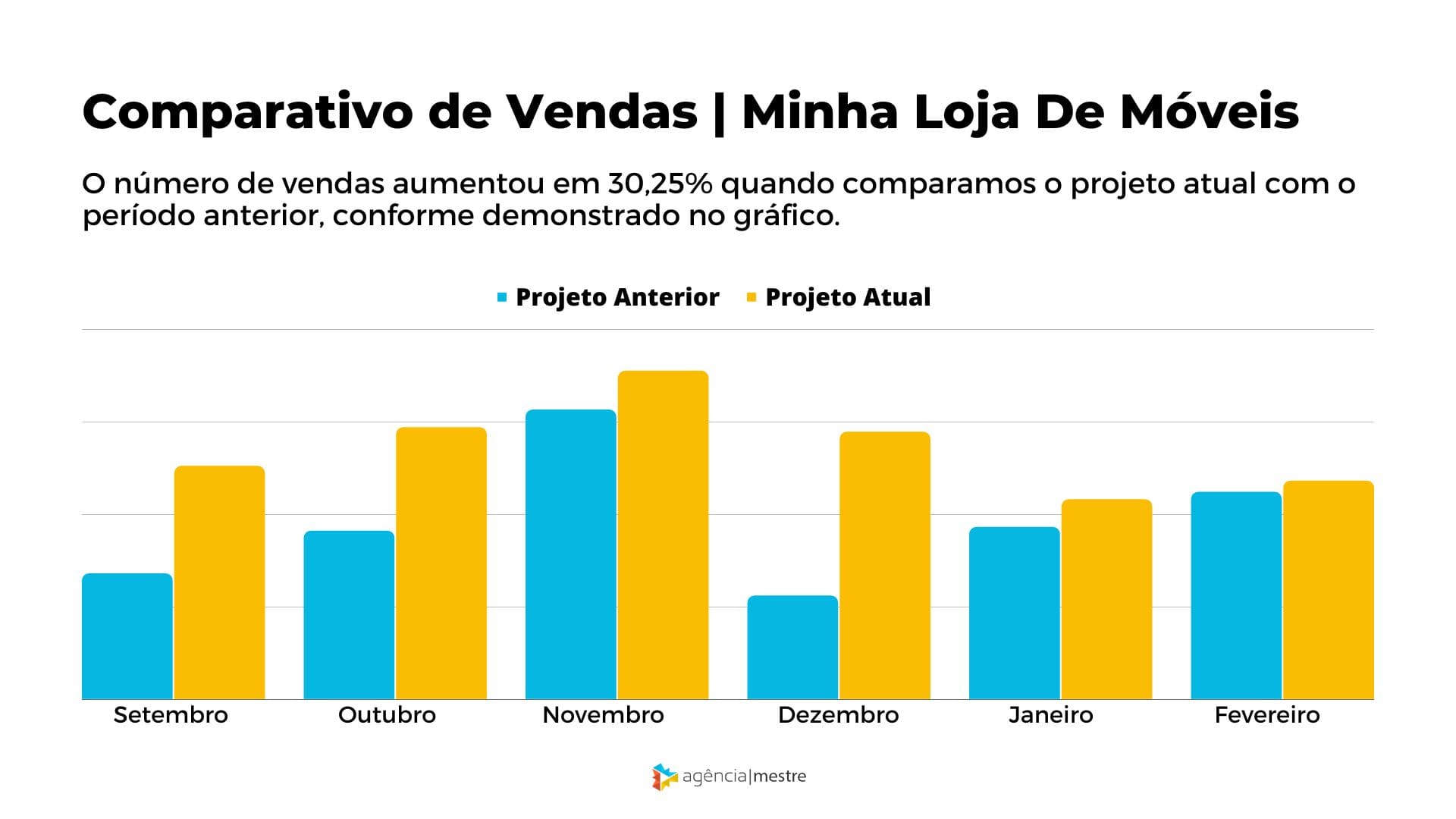 Nesse projeto, quando comparamos o período entre setembro de 2021 e março de 2022 (quando a Agência Mestre ainda não era parceira da Minha Lojas De Móveis), com setembro de 2022 e março de 2023, temos:
