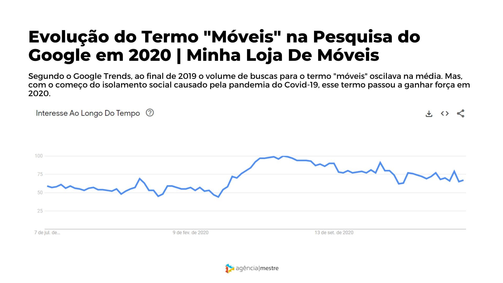 As buscas pelo simples termo “móveis” cresceram significativamente durante todo o ano de 2020, segundo o Google Trends. Isso aconteceu porque as pessoas pararam para observar suas próprias casas. O que antes era apenas um espaço para dormir, na maioria das vezes, agora era um escritório, uma sala de aula, um cinema, um restaurante… basicamente, todos os ambientes.