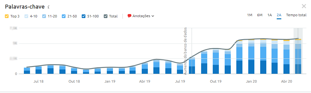 Crescemos significativamente no número de palavras-chave posicionadas. Principalmente no Top 3 das posições — destaque em amarelo no gráfico. Como podemos ver, em 2019 não havia a presença relevante da barrinha amarela. Já em abril de 2020, ela é bastante evidente.