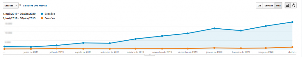 Em números, o gráfico anterior representa um crescimento de 772% no tráfego orgânico, no comparativo entre os anos — maio de 2019 até abril 2020 Vs maio de 2018 até abril de 2019.