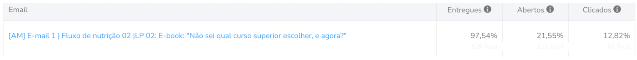 Um grande ponto de vitória nessa ação foi que, em um de nossos fluxos, tivemos ótimos resultados, principalmente no primeiro e-mail, em que entregamos um e-book com uma checklist para ajudar o estudante a reconhecer suas habilidades.