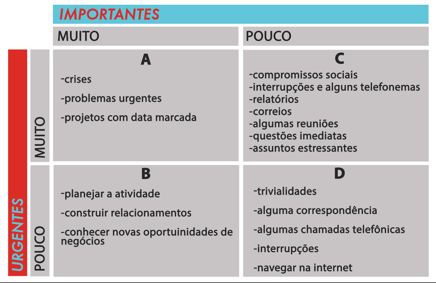 Antes de estabelecer as suas prioridades, é necessário entender o que é urgente ou importante e até mesmo o que é urgente, porém, não importante. Para facilitar, disponibilizamos esse quadro abaixo para você entender onde deve encaixar cada tarefa.