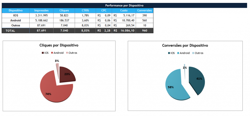 Utilize a mesma lógica que mencionei para personas aqui: quebre mais ainda as suas análises. Ao executar esta estratégia aqui na Mestre, estávamos lendo os dados adquiridos e queríamos saber como e onde consumia-se tanto os anúncios. Foi aí que a ideia de segmentar por dispositivo veio. Conseguimos notar que Android possuía um maior nível de impressões e menos conversões do que iOS. Estava aí mais uma segmentação e priorização para a campanha.