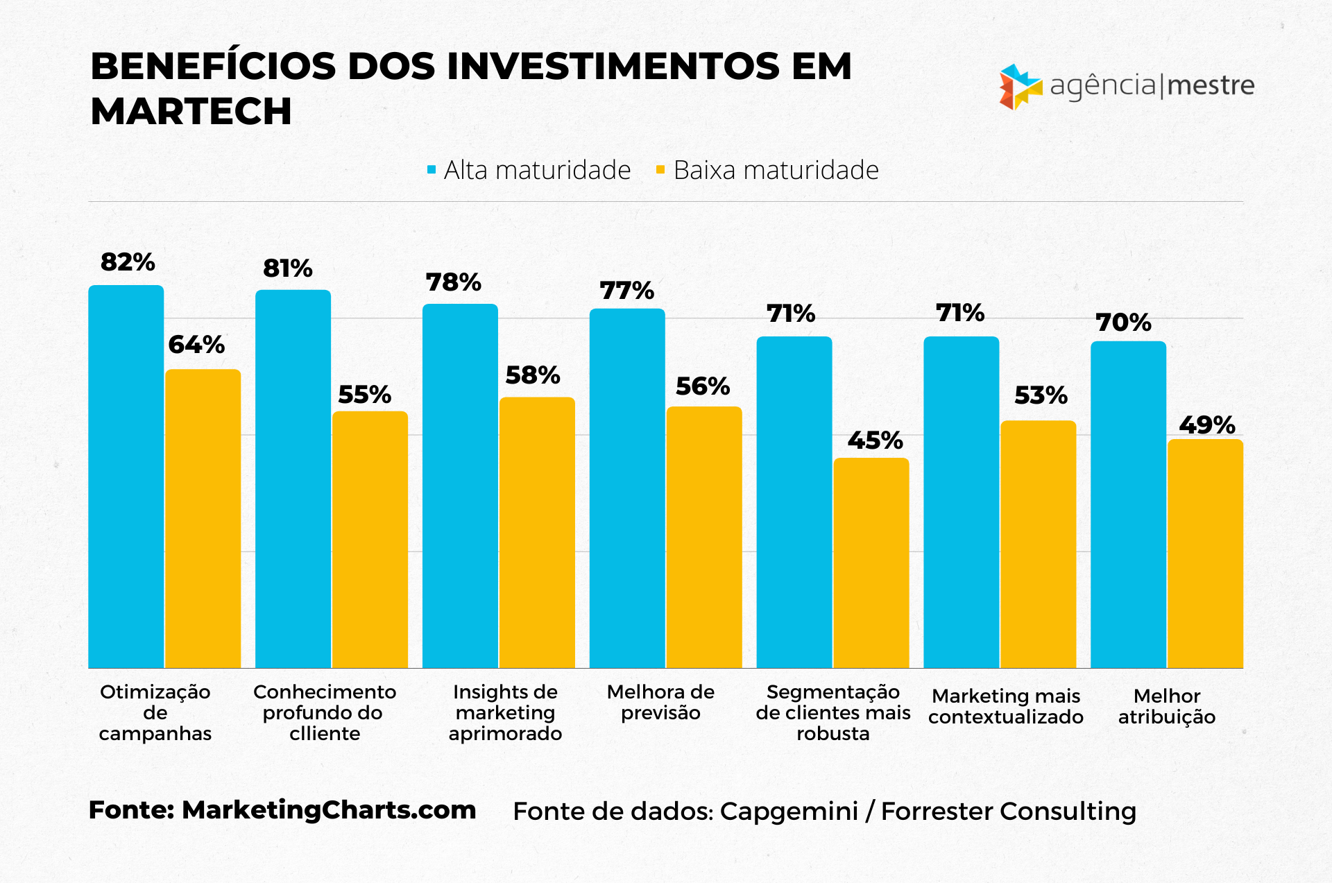 As empresas de alta maturidade se mostraram muito mais propensas do que as de baixa maturidade a relatar maior geração de leads, melhorias nas taxas de conversão e aumento da receita de vendas.