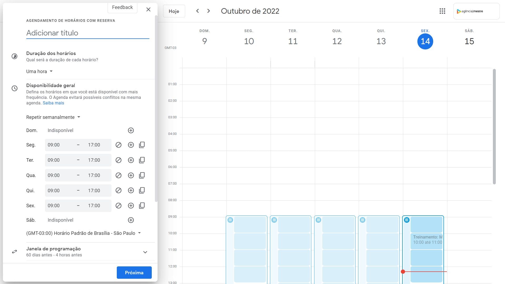 2. Vai aparece uma aba lateral onde você poderá incluir o título do agendamento (por exemplo: Reunião de Apresentação de Proposta), definir a duração do compromisso e os dias e horários de disponibilidade;