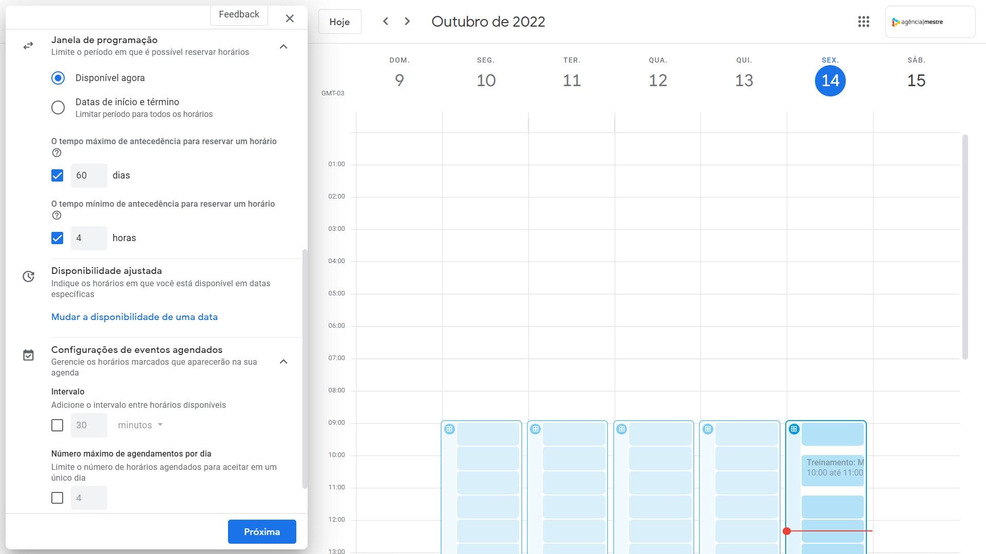 3. Logo abaixo, é possível definir um período em que esses horários de agendamento estarão disponíveis, bem como o limite de agendamentos diários e o horário de pausa entre um agendamento e outro. Você ainda pode definir prazos para o agendamento, com o limite máximo e mínimo;