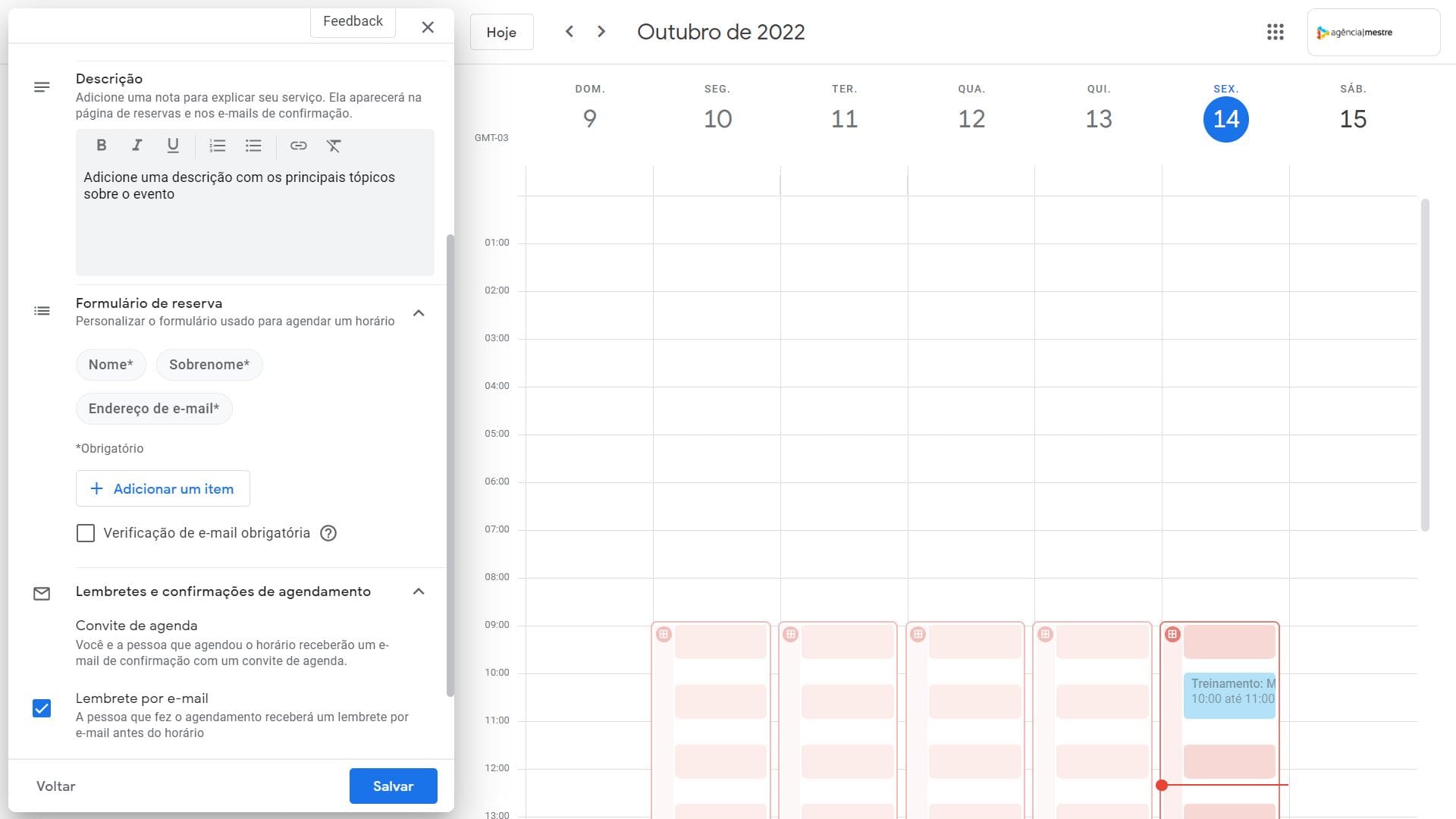 4. Clicando em “Próximo”, você poderá incluir uma descrição do evento, o formulário de agendamento (exemplo: nome e e-mail) para ter as informações prévias do participante e incluir um lembrete para ser disparado por e-mail antes do encontro.